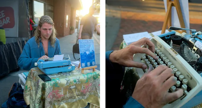 It's was just past three o'clock and the sun was beginning to hide behind the palm trees when I found Karl the Poet — almost shirtless and mystical as a desert prophet, his skyblue typewriter perched before him like an altar. A true desert ascetic he accepts my five dollars, a bit below his suggested pricing, and crafted me a poem about why trees have so many leaves. "I like it", he says, he vibing. I ask, "Do you consider your self a mystical guy?". Karl pauses and entertains my questions, "My feet right here on this concrete," he told me, "they tune into the Earth beneath the concrete, and I know that the Earth is still holding me." He's been crafting poems for strangers for six or seven months now, tapping out what he calls "linguistic medicine from his celestial heart." Some folks ask him for silly verses; others pour out their deepest griefs, like the woman who lost her son under a tree. It's a rare profession full of meaning and sincerity.